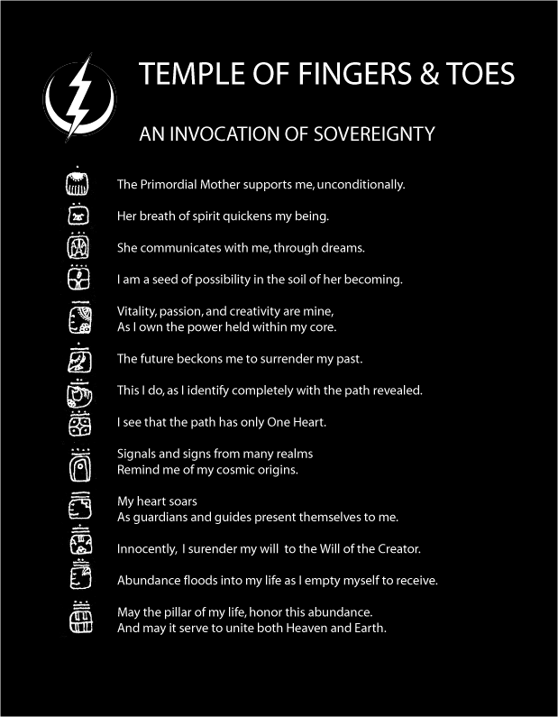 As indicated above, the tzolkin organizes consecutive glyphs into 20 groups of 13. I call these groups “temples of the imagination’” and have written an “invocation of sovereignty” for each one. THIRTEEN BEN is the final number/glyph code for the Temple of Fingers and Toes and thus corresponds to the following line from the invocation, the full text of which follows this quote: